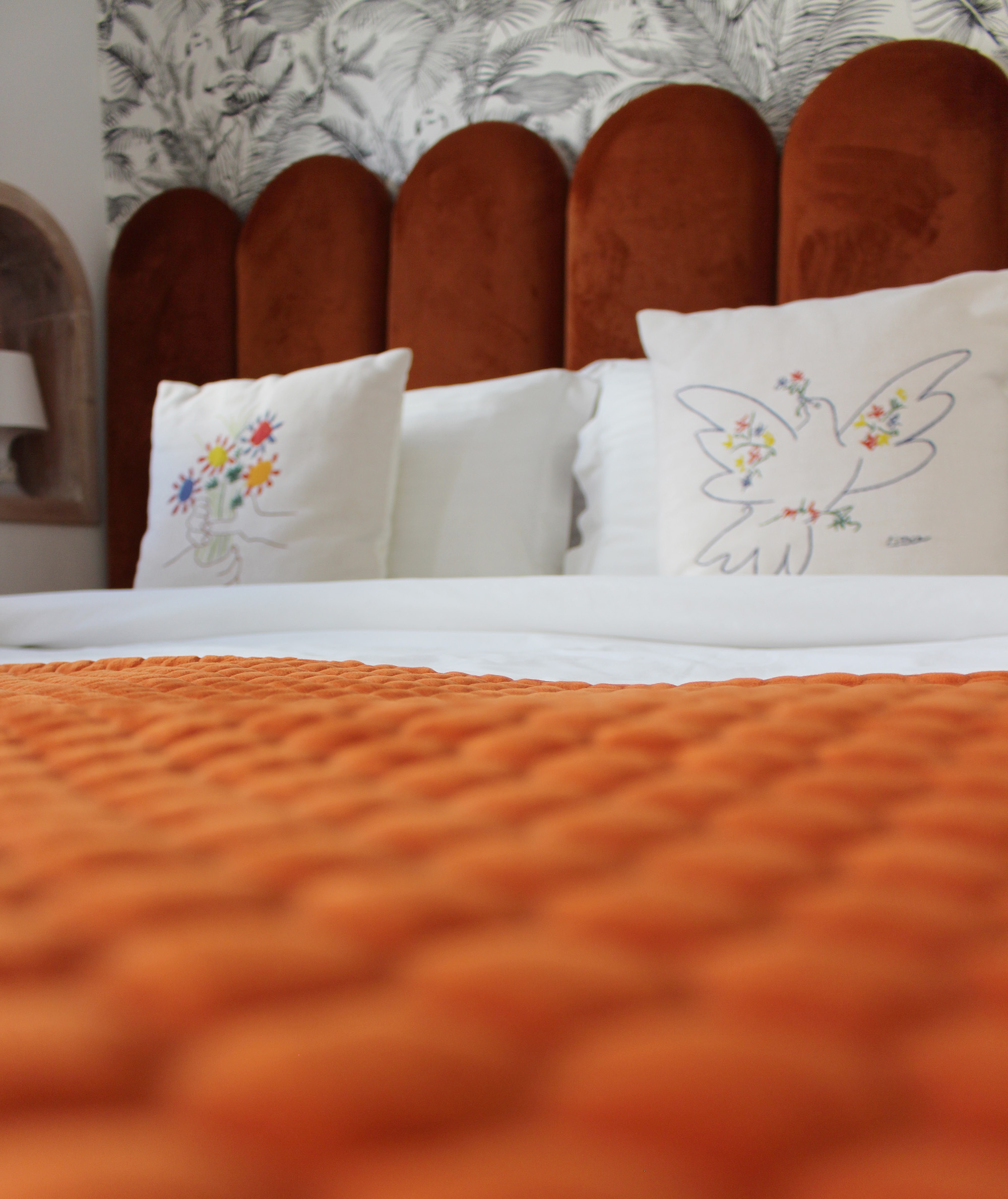Située au 1er étage, Kenzi, une chambre au caractère éclectique à croquer sans modération ; trouvez votre ambiance et profitez d’un cadre unique. Elle dispose d’un lit double (180 x 200cm) uniquement avec son canapé détente ainsi qu’une salle de bain privative. Nos tableaux artistiques ne sont jamais très loin. Si vous voulez découvrir plus, direction notre galerie d’art au rez-de-chaussée.
