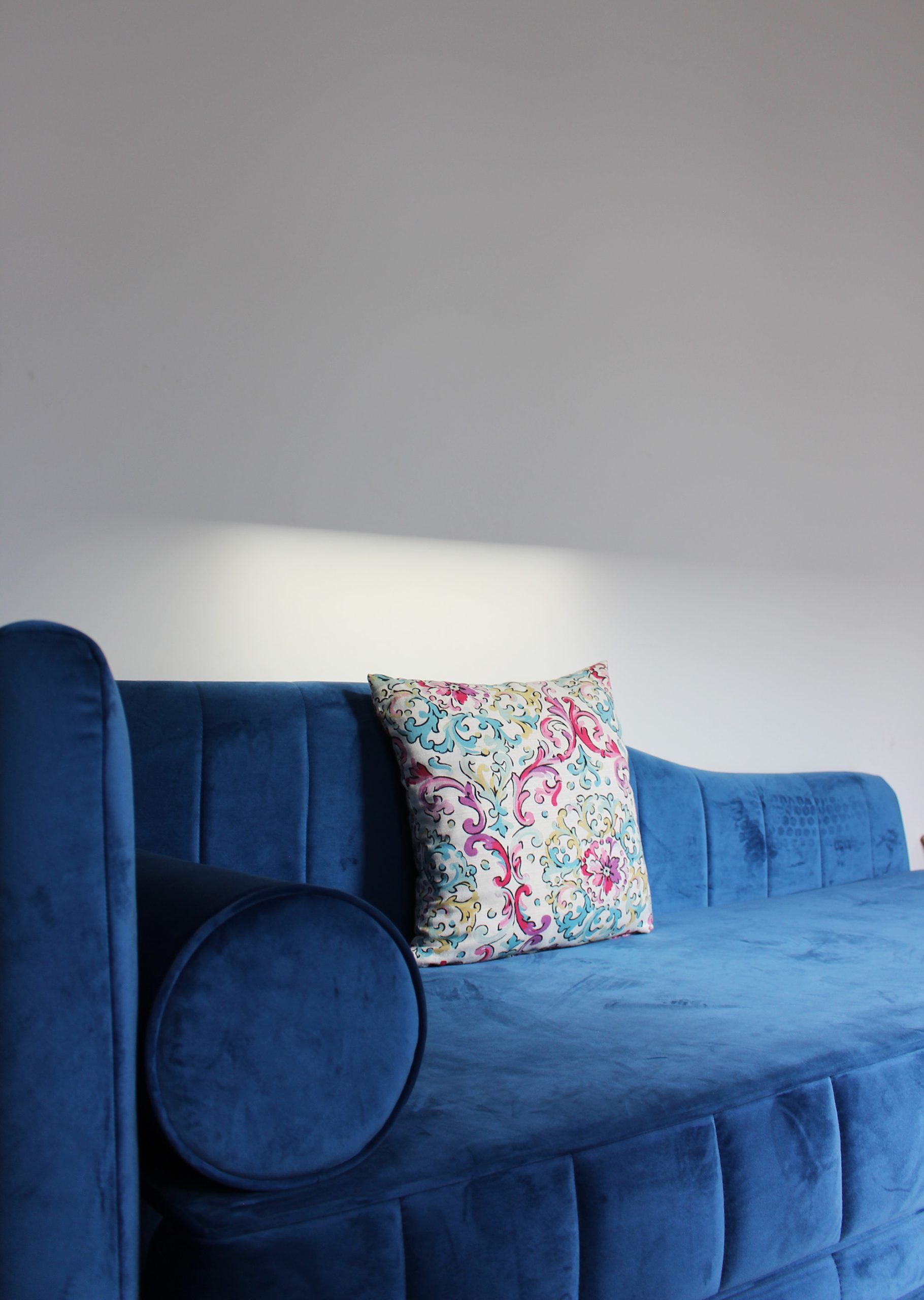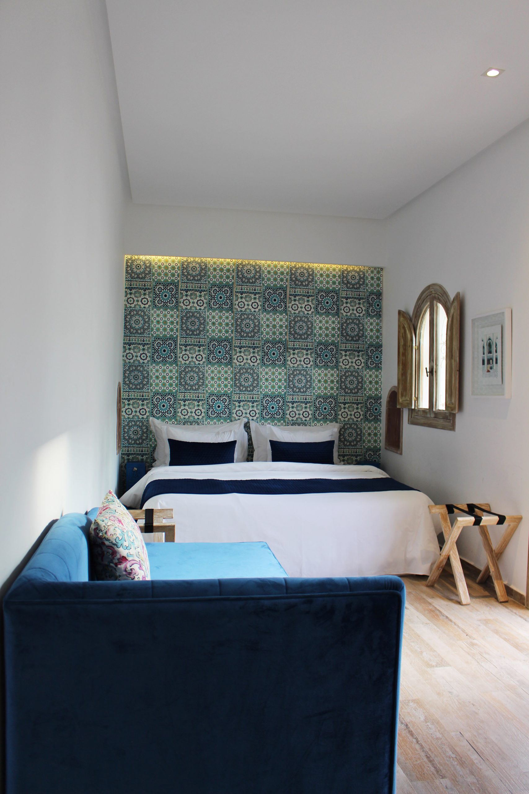 Située au premier étage par un escalier, la chambre se trouve sur un petit couloir qui donne sur le patio en bas, et sur le toit décapoté vers les terrasses au Rooftop. Vous disposez d’un canapé bleu en velours, convertible et ambiance cosy. Parfait pour un couple avec enfants.