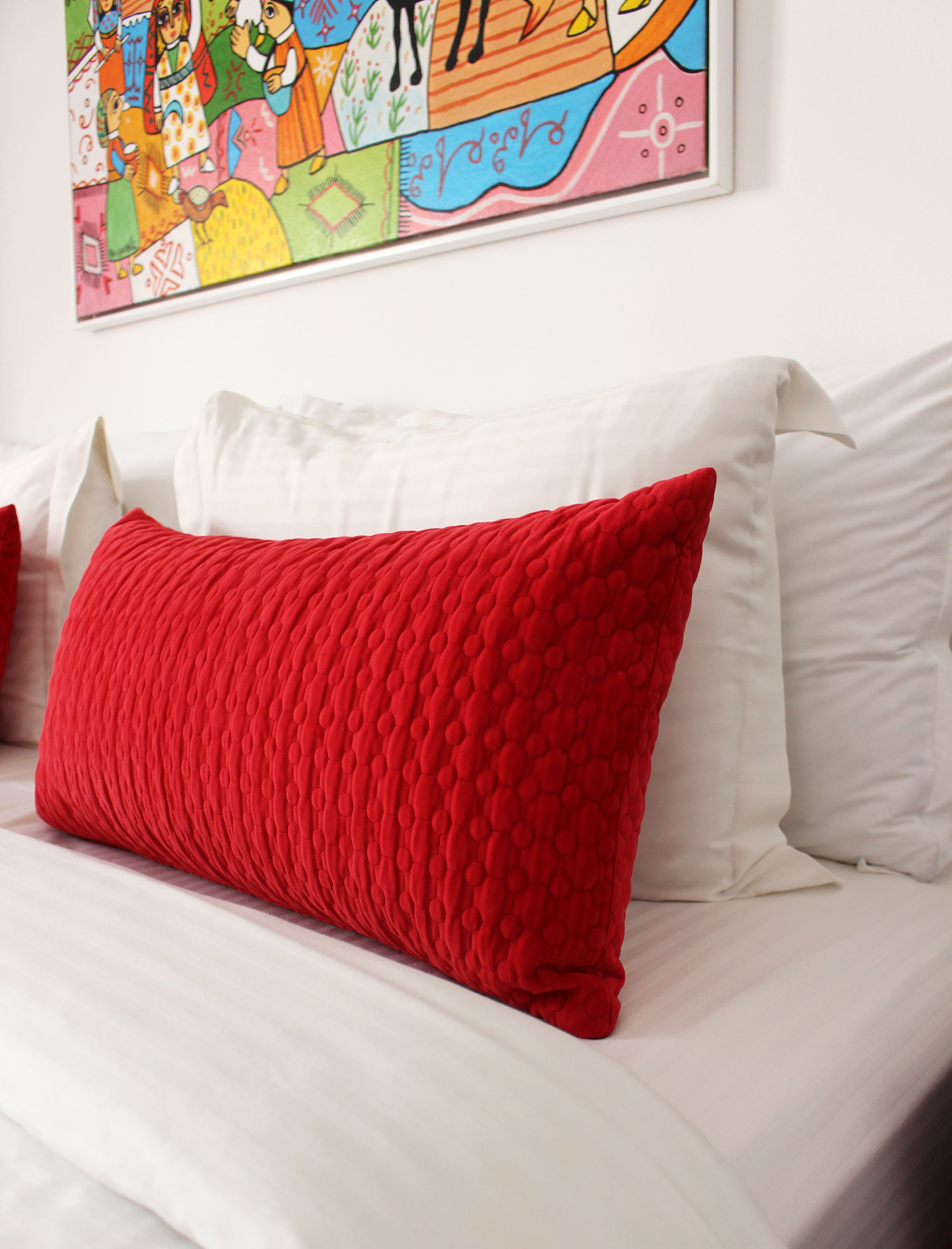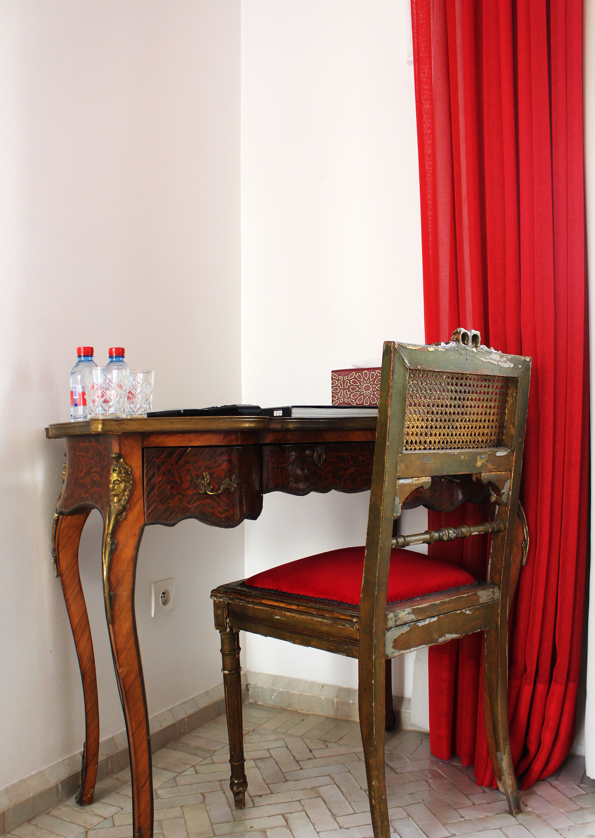 Our wooden furniture is worth a visit. Perched on the first floor, the bedroom leads from its hallway to the pool below and the rooftop above. It is a soft room in shades of beige, white and red. Its double glazed windows overlook an alley of the Medina of Rabat.